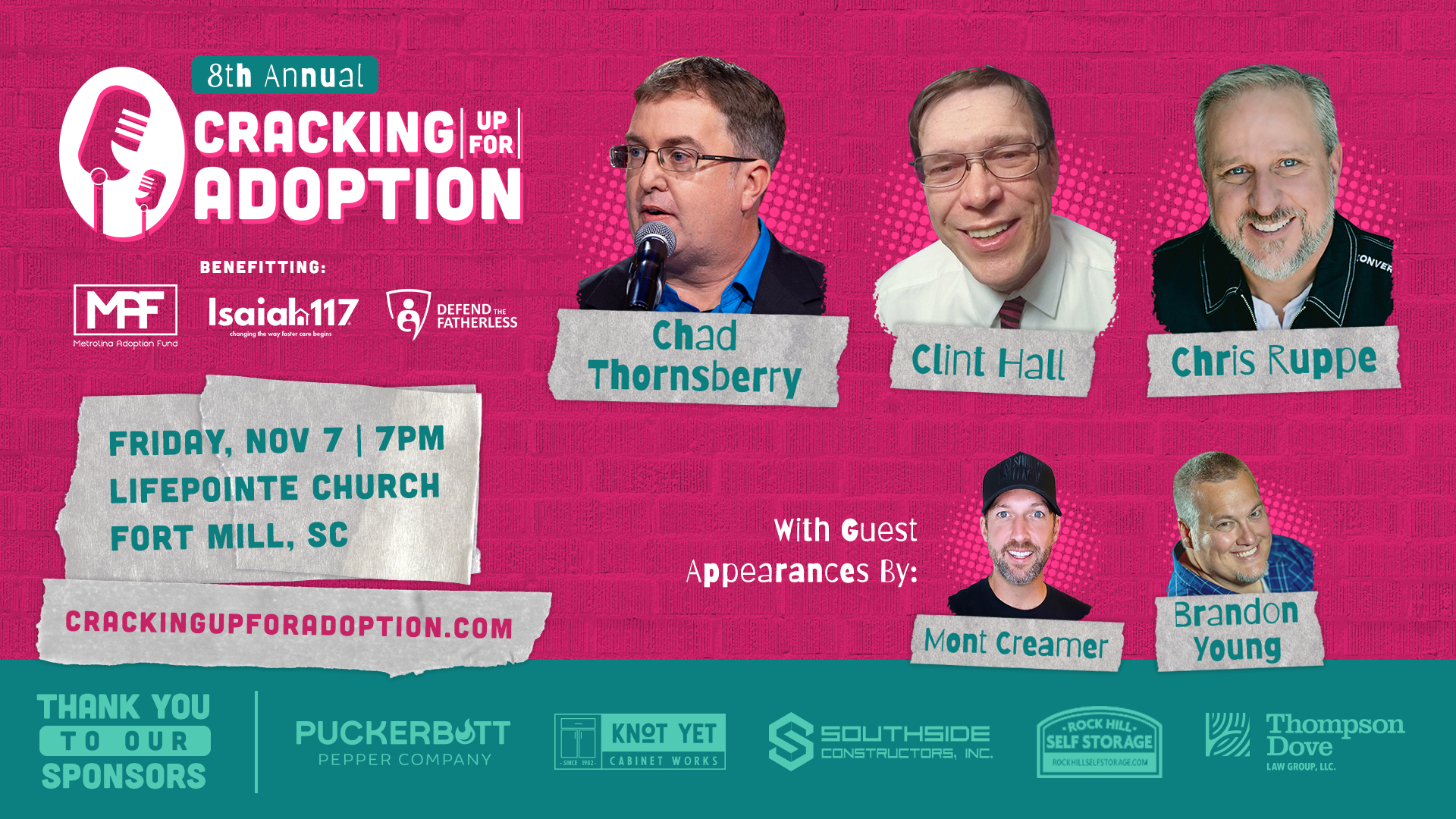 Join us for the 8th Annual Cracking Up For Adoption comedy show at Lifepointe Church in Fort Mill, SC Friday, November 7, 2025 at 7 PM.